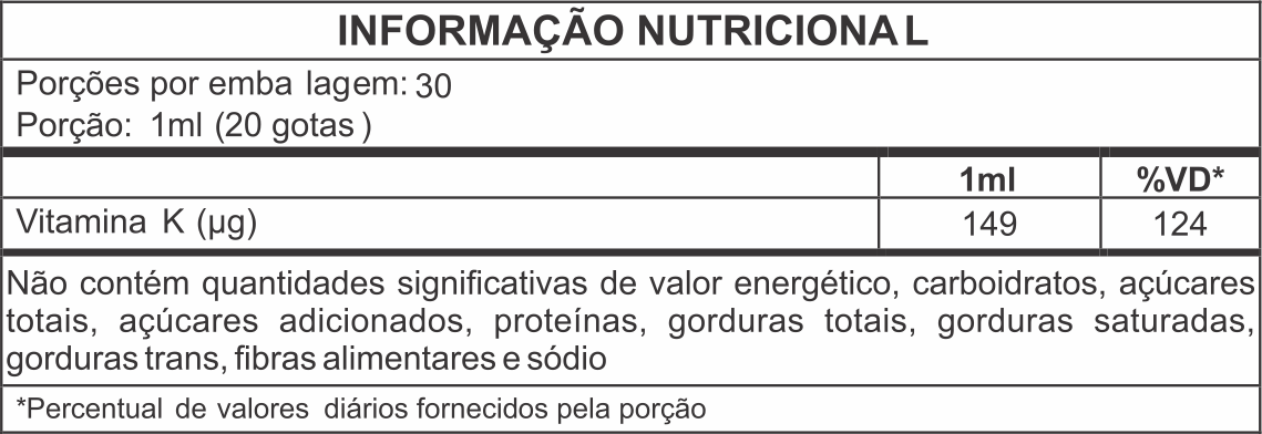 INGREDIENTES: Água potável, menaquinona-7, estabilizante glicerol, aromatizante, conservante sorbato de potássio, sequestrante EDTA cálcio dissódico, acidulante ácido cítrico e edulcorante sucralose.